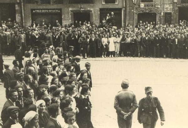 30 червня 1941 року. Львів'яни в очікуванні проголошення Акту відновлення державності. Впадають в око вивіски "Риба. Овочі. Фрукти" і "Хемпром". Фото: архів ЦДВР