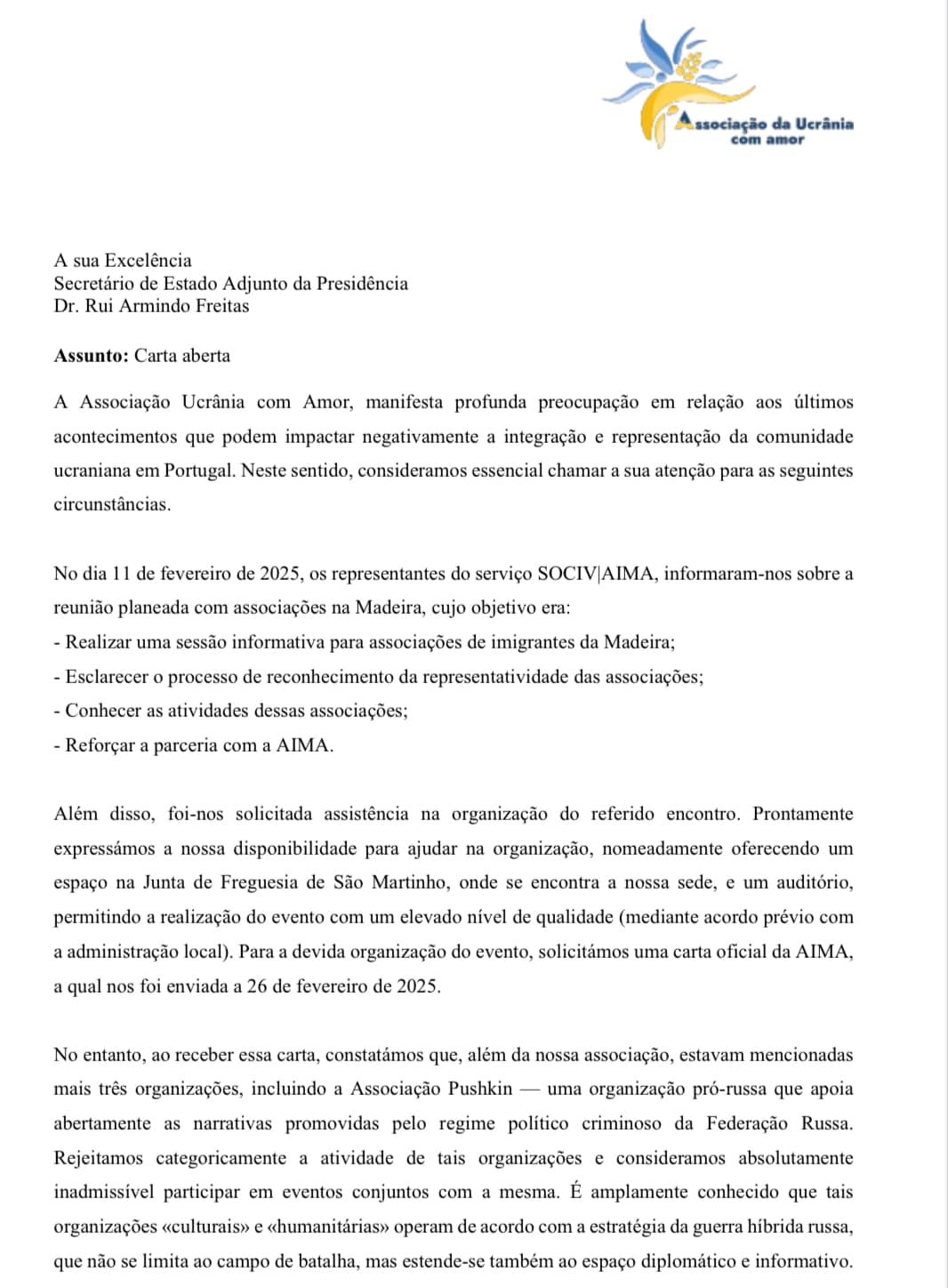 На скриньки українських організацій в Португалії надходять листи від невідомого руху «Pombos pela Paz” (Голуби миру), які хочуть організувати 24 лютого все національну акцію за мир в