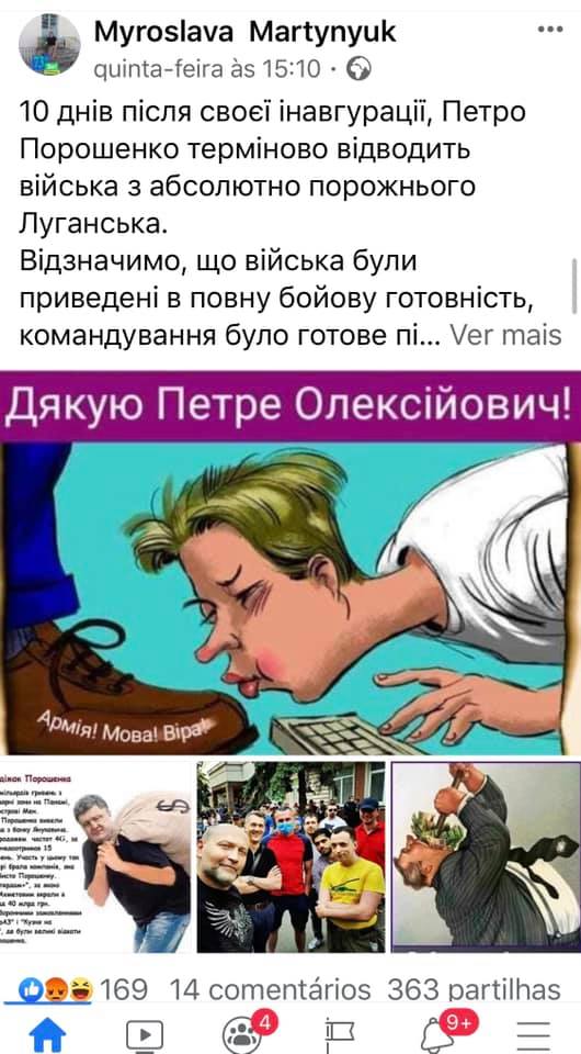 За часів президенства Порошенка, у Лісабоні дуже активним захисником п’ятого президента була така-собі Мирослава Мартинюк, голова Асоціації «Словесна піраміда». Відразу, після перемоги Зеленського на виборах минулого року, ця спритна пані почистила всі свої сторінки у соціальних мережах і з прихильника, паптово стала активним критикантом п’ятого президента.