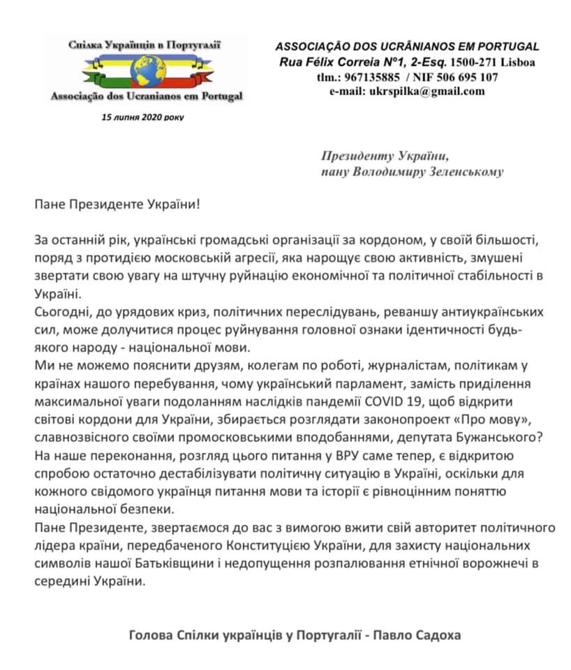 Ми не можемо пояснити друзям, колегам по роботі, журналістам, політикам у країнах нашого перебування, чому український парламент, замість приділення максимальної уваги подоланням наслідків пандемії COVID 19, щоб відкрити світові кордони для України, збирається розглядати законопроект «Про мову», славнозвісного своїми промосковськими вподобаннями, депутата Бужанського?