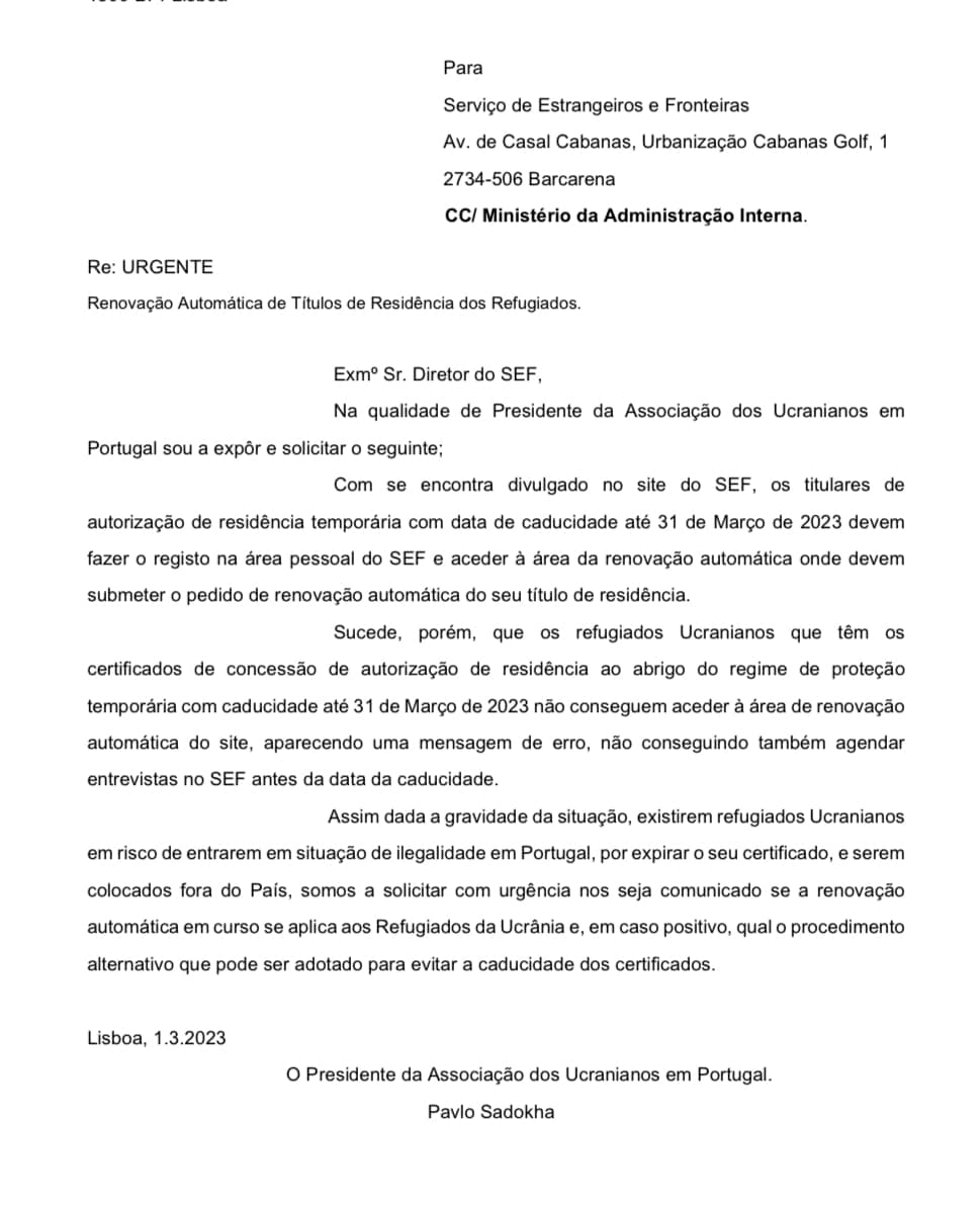 3Спілка українців у Португалії звернулася офіційним листо до Директора міграційної служби Португалії з проханням дати роз’яснення щодо процедури продовження Дозволу на перебування переселнців з України, а також звернула увагу на труднощі з отриманням статусу тимчасового притулку для переміщених осіб з України.