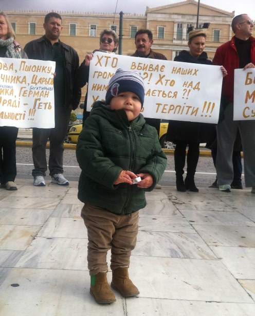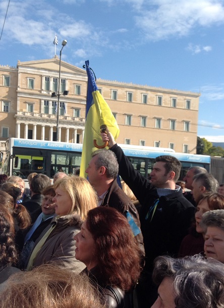 В столиці Греції Афінах відбулася масова акція протесту на підтримку київського Майдану. Грецькі українці зібралися на центральній площі Афін, площі Конституції, що перед Еллінським парламентом. Увагу перехожих привертали чисельні прапори та плакати, виготовлені українсько та грецькою мовами, якими учасники акції намагалися швидко показати грецьким друзям своє ставлення до подій, які відбуваються в Україні. Варто зазначити, що більшість громадян Греції жваво цікавляться долею нашої Батьківщини та щиро бажають якнайшвидшого вирішення кризової ситуації без людських втрат. Варто зазначити, що українське віче викликало неабияку зацікавленість у грецької преси, представники якої прибули на площу Конституції та спілкувалися з учасниками афінського Майдану, що транслювалося у випусках вечірніх новин майже всіх центральних каналів Греції.