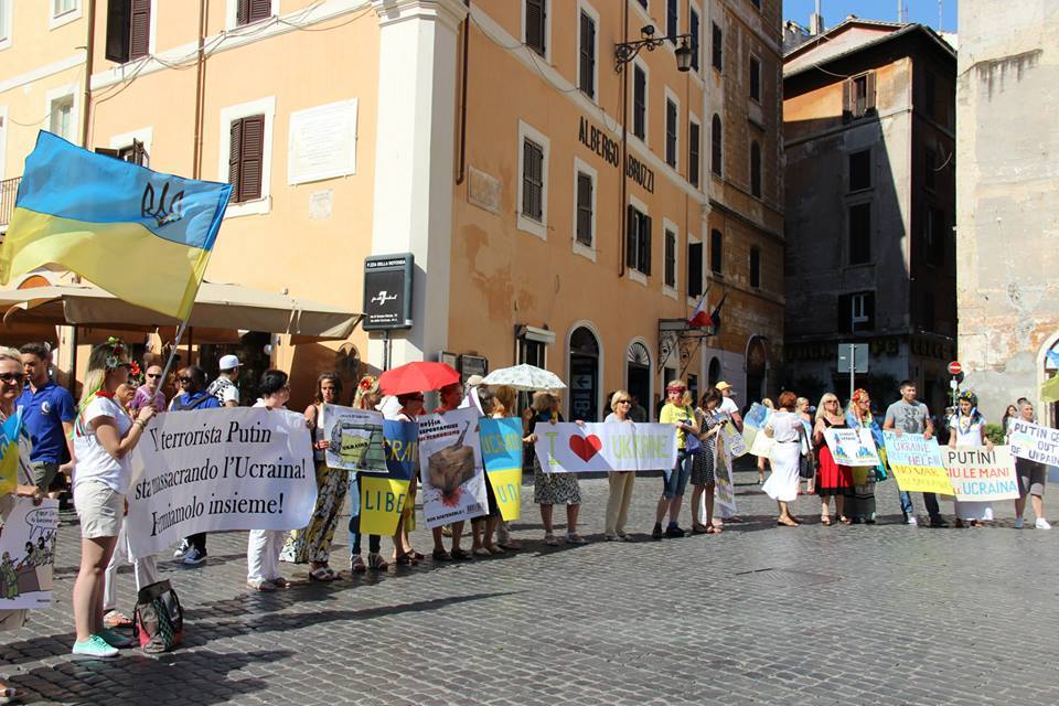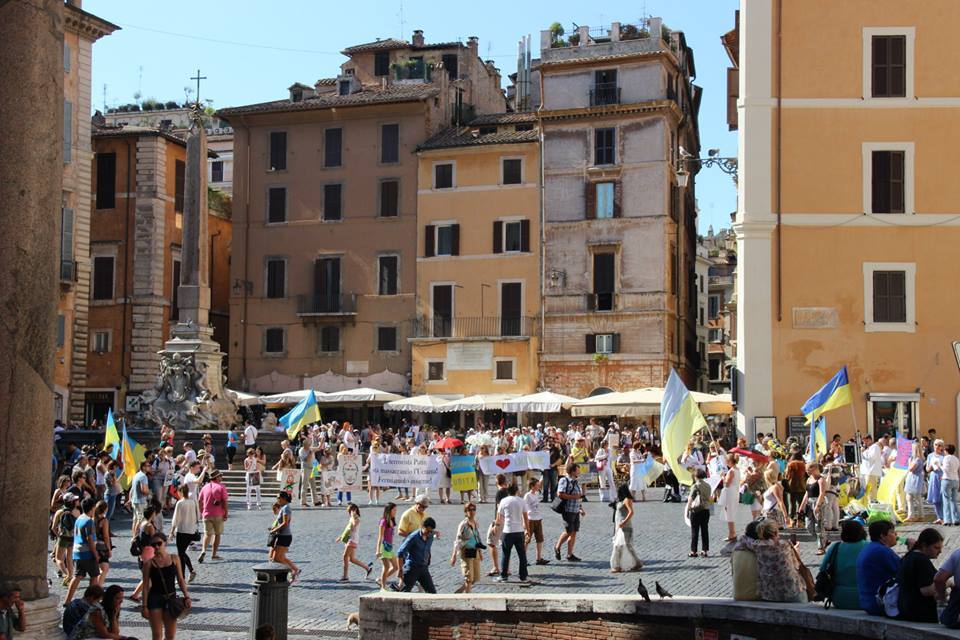Рим, 6 липня. Незважаючи на спеку, римський Євромайдан провів сьогодні маніфестацію проти російського тероризму в Україні. Декілька десятків українців з національною символікою та антипутінськими гаслами розповідали під стінами древнього Пантеону туристам зі всього світу про те, що Росія спонсорує тероризм, путінська пропаганда нагло бреше, а українська армія професійно бореться з злочинцями, захищаючи мирних жителів. Члени Оргкомітету виготовили листівки трьома мовами і роздавали їх. Для наочності, родина Семеняк підготувала флеш моб з символічною “Україною” та “катами” з російськими нашивками і з руками замащеними кров’ю.