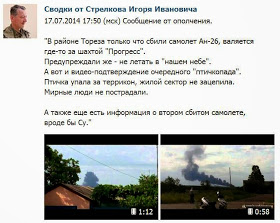 Por sua vez, o chefão terrorista, famigerado Igor Girkin “Strelkov”, inicialmente não tinha percebido que o alvo foi o aparelho internacional, gabou-se publicamente que as suas forças abateram mais um An-26 ucraniano. Eis o que escreveu o terrorista internacional na sua página na rede social VK: