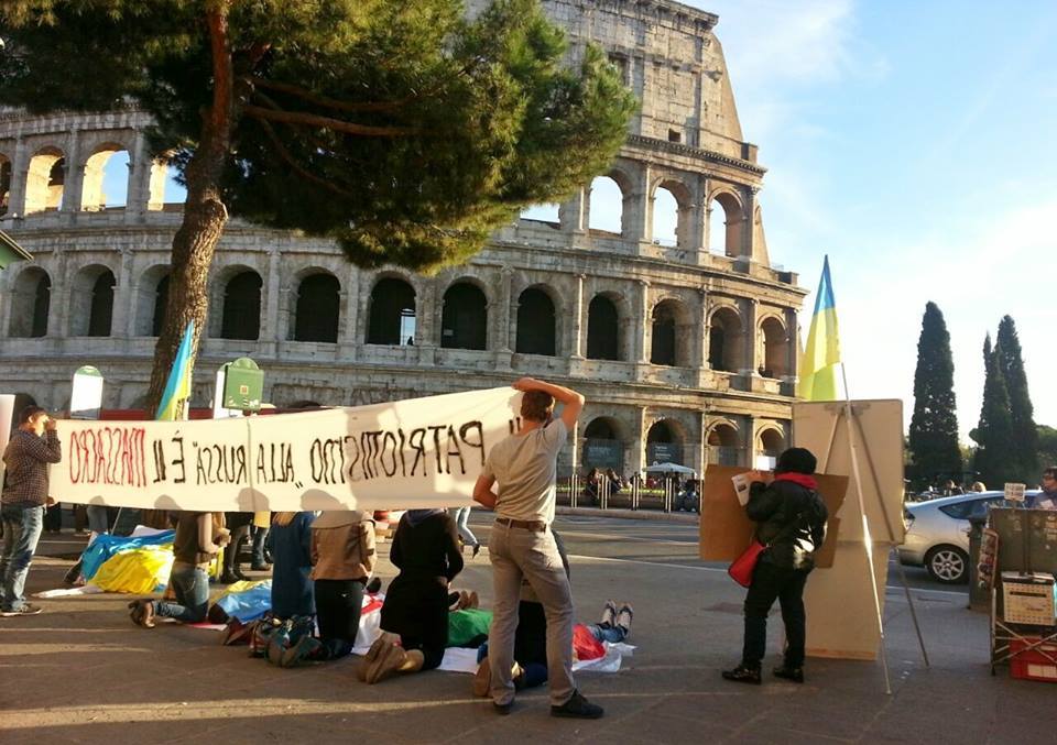 20 листопада, українці Риму влаштували чергову театралізовану акцію у найбільш людному місці італійської столиці — під Колізеєм. Флеш-моб був присвячений річниці подій на Майдані в Києві та проти російської окупації українських територій в Криму та на Донбасі. Про це VIDIA повідомив координатор Оргкомітету Євромайдан Рим Олесь Городецький.