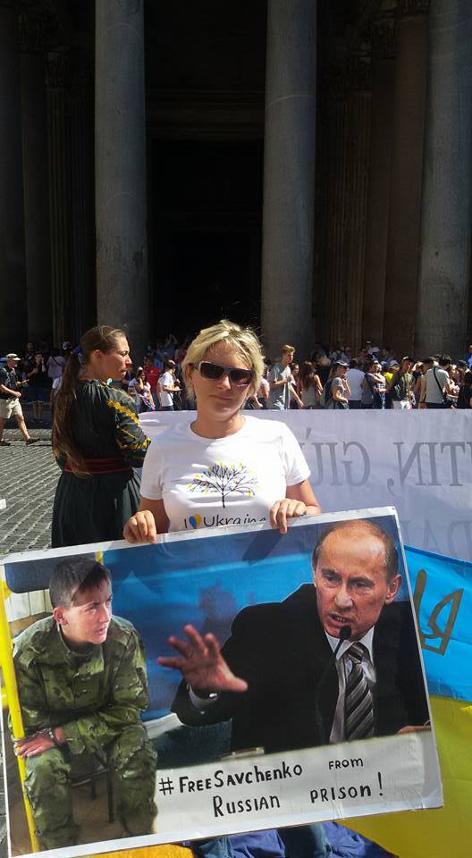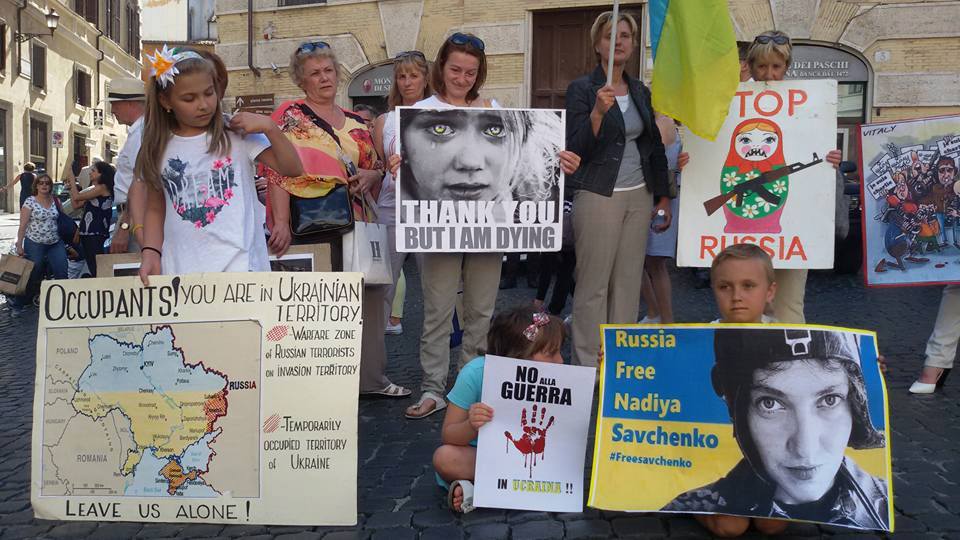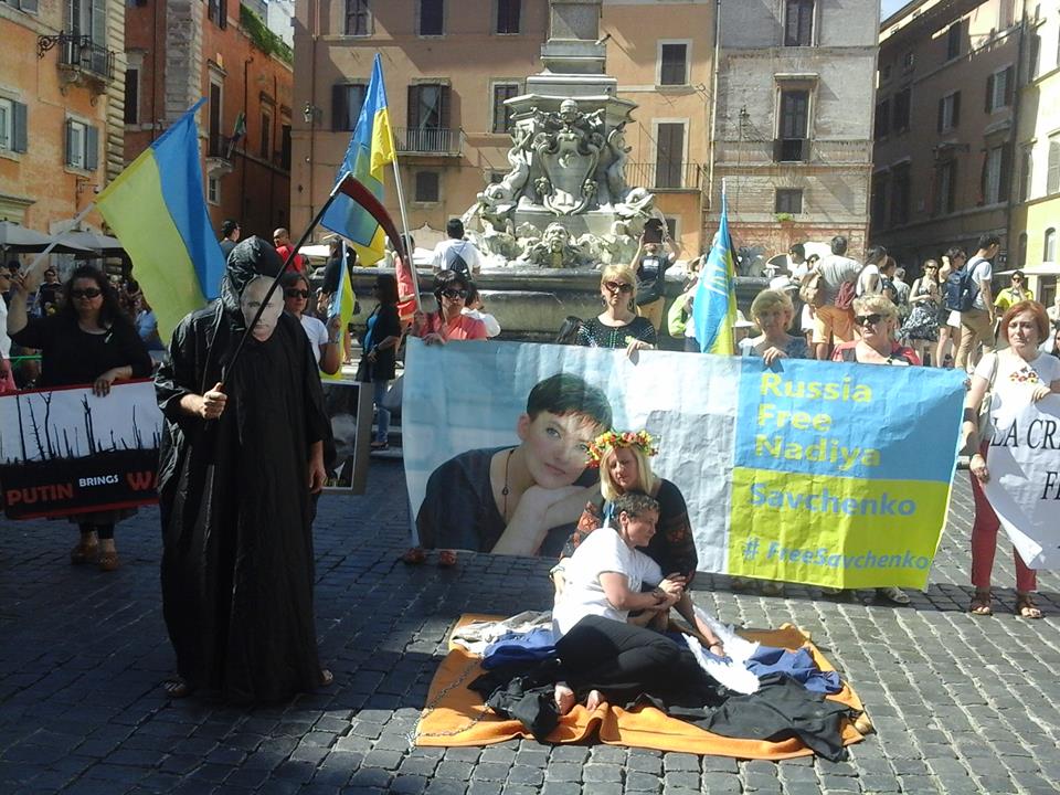 В неділю, 21 червня, українці Риму знову заполонили площу навпроти древнього Пантеону: відбулася чергова маніфестація української громади. Цього разу темою заходу став протест проти російської агресії в Україні та вимога негайного звільнення Надії Савченко, яка вже рік є в’язнем сумління в російській тюрмі.