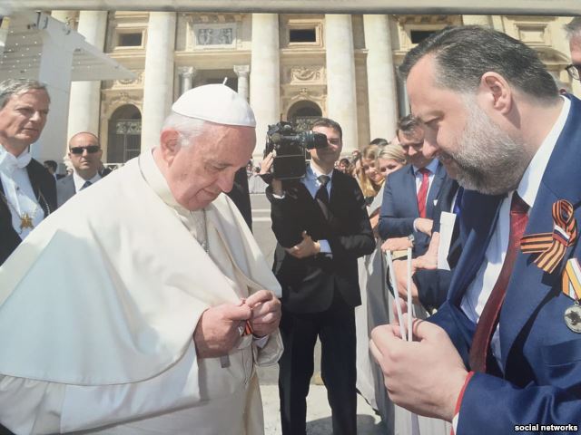 У четвер російські засоби масової інформації поширили новину про те, що в середу, під час загальної аудієнції у Ватикані, депутат Держдуми Росії від КПРФ Павло Дорохін привітав папу Римського Франциска із «дньом Побєди» і подарував йому «георгіївську стрічку». Депутат у коментарі також зазначив, що «Папа сам її надів на рясу». Спочатку багато хто сприйняв цю новину як черговий фейк Кремля – такою неправдоподібною вона здавалася. Але чисельні фото події не залишали сумніву: це не фейк! Папа дійсно одягнув «георгіївську стрічку»!