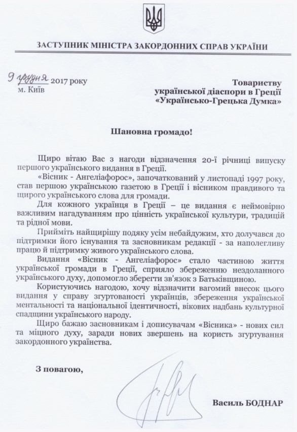З нагоди 20-ліття випуску першої та єдиної української газети в Греції з грецьким додатком «Вісник-Анґеліафорос» (листопад 1997)