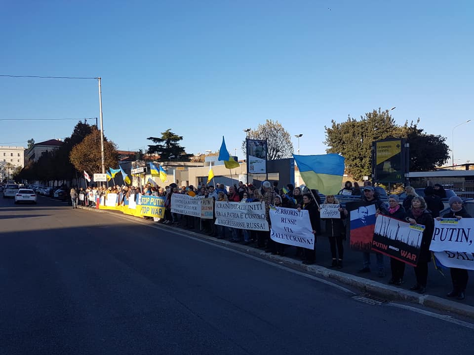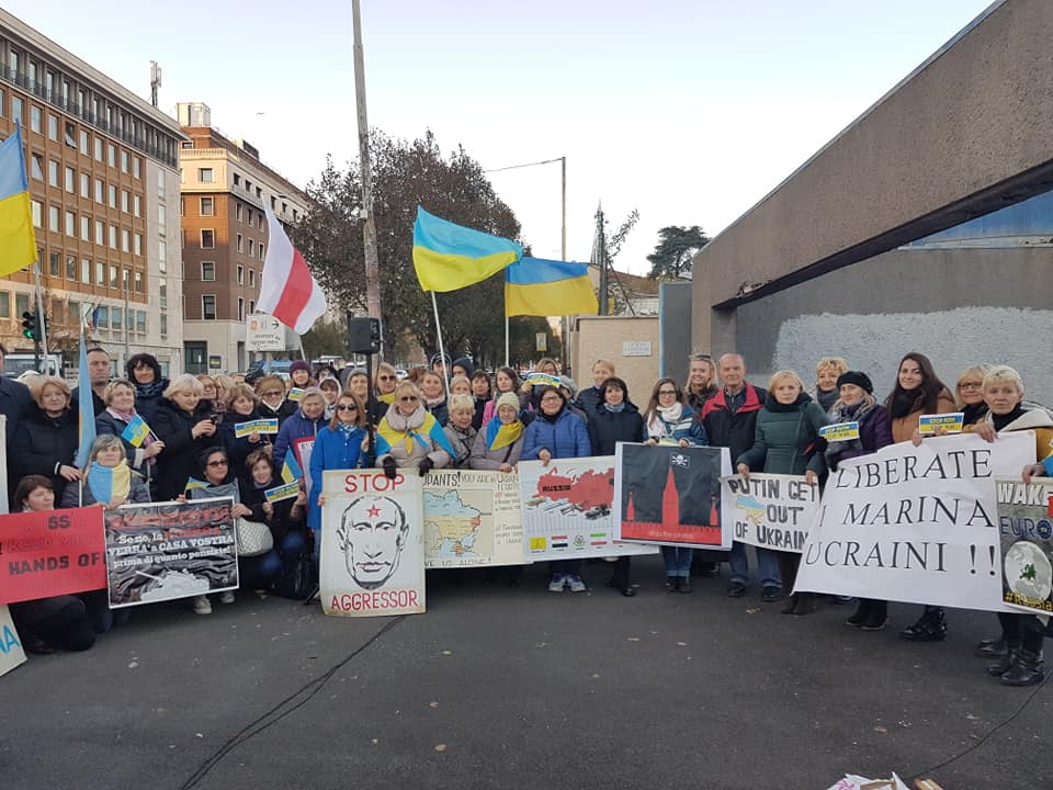 Близько 150 українців вийшли сьогодні на акцію протесту під посольство РФ в Італії, щоб засудити напад на українські кораблі у Керченській протоці. Присутні тримали національну символіку, плакати італійською та англійською мовами з закликами до Путіна забиратися геть з України та поясненням останньої російської атаки на українські кораблі.