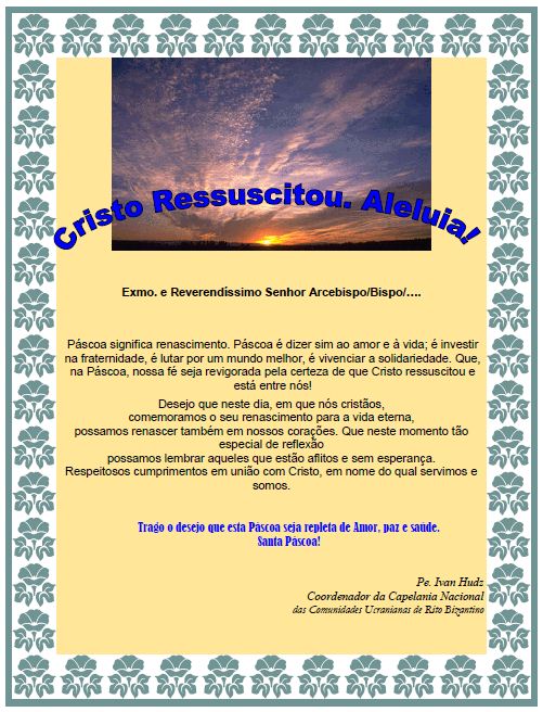 Desejo que neste dia, em que nós cristã os, comemoramos o seu renascimento para a vida eterna, possamos renascer também em nossos corações. Que neste momento tã o especial de reflexã o possamos lembrar aqueles que estã o aflitos e sem esperança.