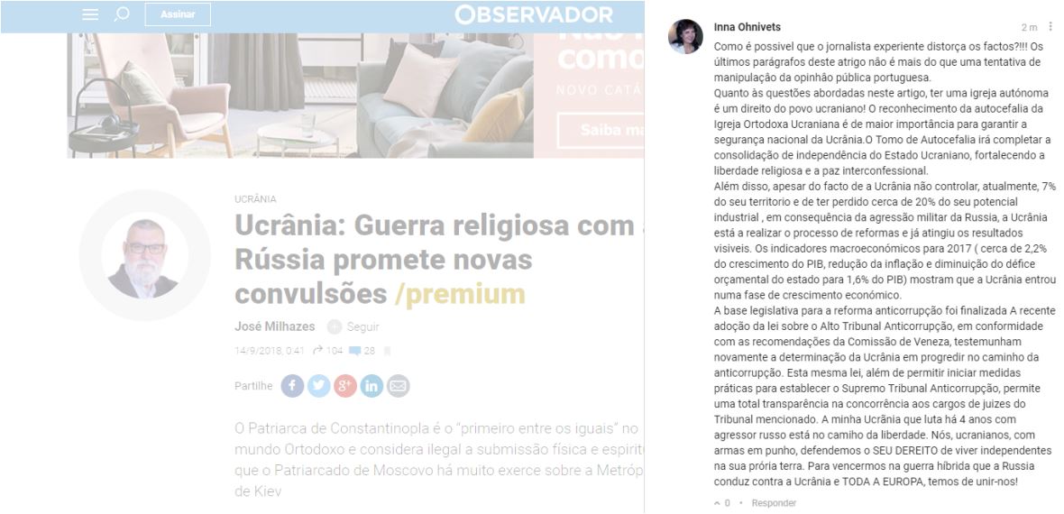 O comentário da Embaixadora da Ucrânia, Inna Ohnivets, ao artigo de opinião de José Milhazes, intitulado “Ucrânia: Guerra religiosa com a Rússia promete novas convulsões”, publicado a 14 de setembro passado no Observador: