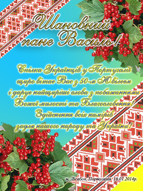 Спілка Українців у Португалії щиро вітає Вас з 50-м Ювілеєм і дарує найщиріші слова з побажаннями Божої милості та Благословення!