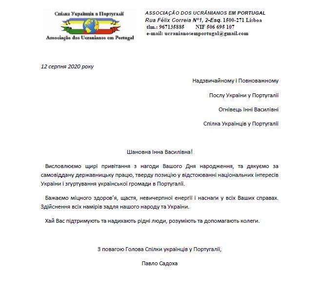 Висловлюємо щирі привітання з нагоди Вашого Дня народження, та дякуємо за самовіддану державницьку працю, тверду позицію у відстоюванні національних інтересів України і згуртування української громади в Португалії.