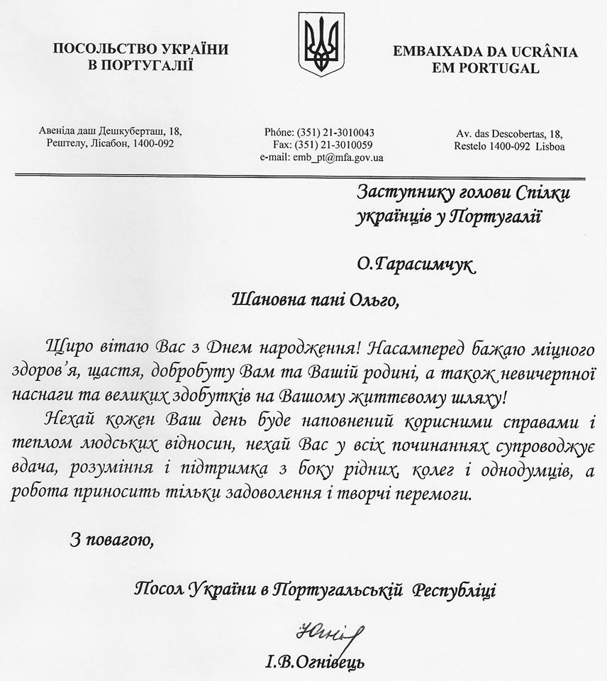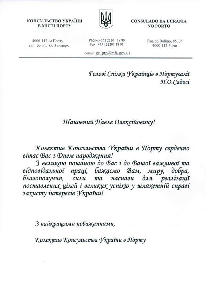 Рада Спілки українців у Португалії сердечно вітаємо Вас з Днем народження.