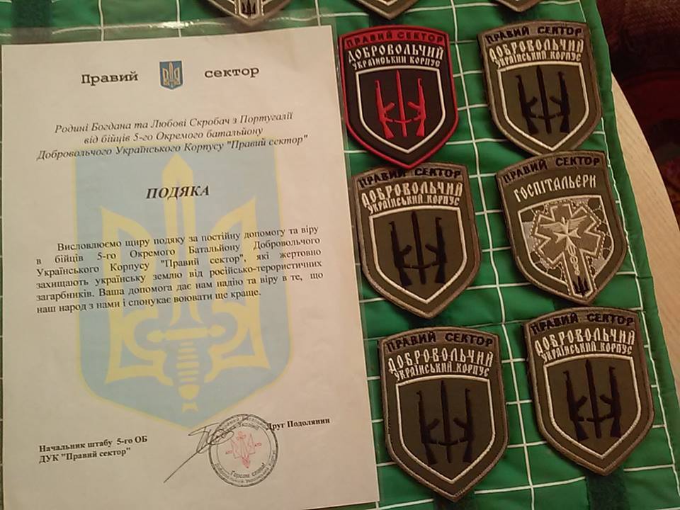 Чи можна передати словами всю ту вдячність, яку ми відчуваємо до бійців 5-го Окремого Батальйону Добровольчого Українського Корпусу "Правий Сектор" в боротьбі за цілісність нашої України. У міру своїх можливостей не байдужі українці з Португалії надіслали чергову допомогу добровольцям ДУК "ПС", адже наближення миру в Україні залежить від внеску кожного.