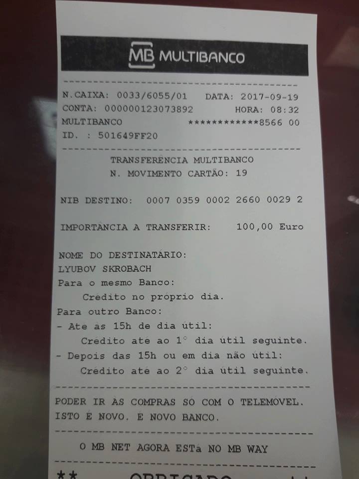 Зібрана допомога від українців Португалії 17.09.17р. в м.Лісабон для добровольців, захисників України. Щиро дякуємо за грошову допомогу: родині Наталі Барчук +20Є, родині Олі Петрів Ферейра +20Є, родині Лади і Михайла Цюпака +20Є, Івану Терещенко +15Є, родині з Албергарії-а-Веля Брах Петро та Любов +20Є, родині з Візеу Бабчук Андрія та Ірини +30Є, родині з Аґеди Уманські Сергія та Надії +50Є, а також щиро дякуємо родинам Володимира та Галини Волошин, Марії та Мар'яну Кравченко, Івану Терещенко за продукти харчування і т.п...