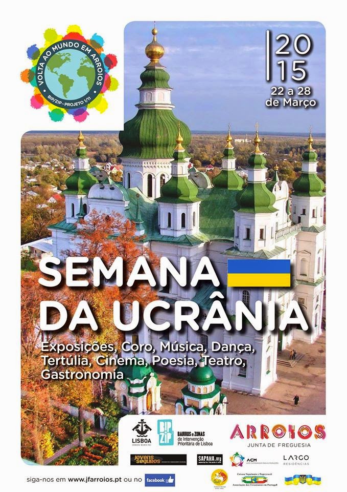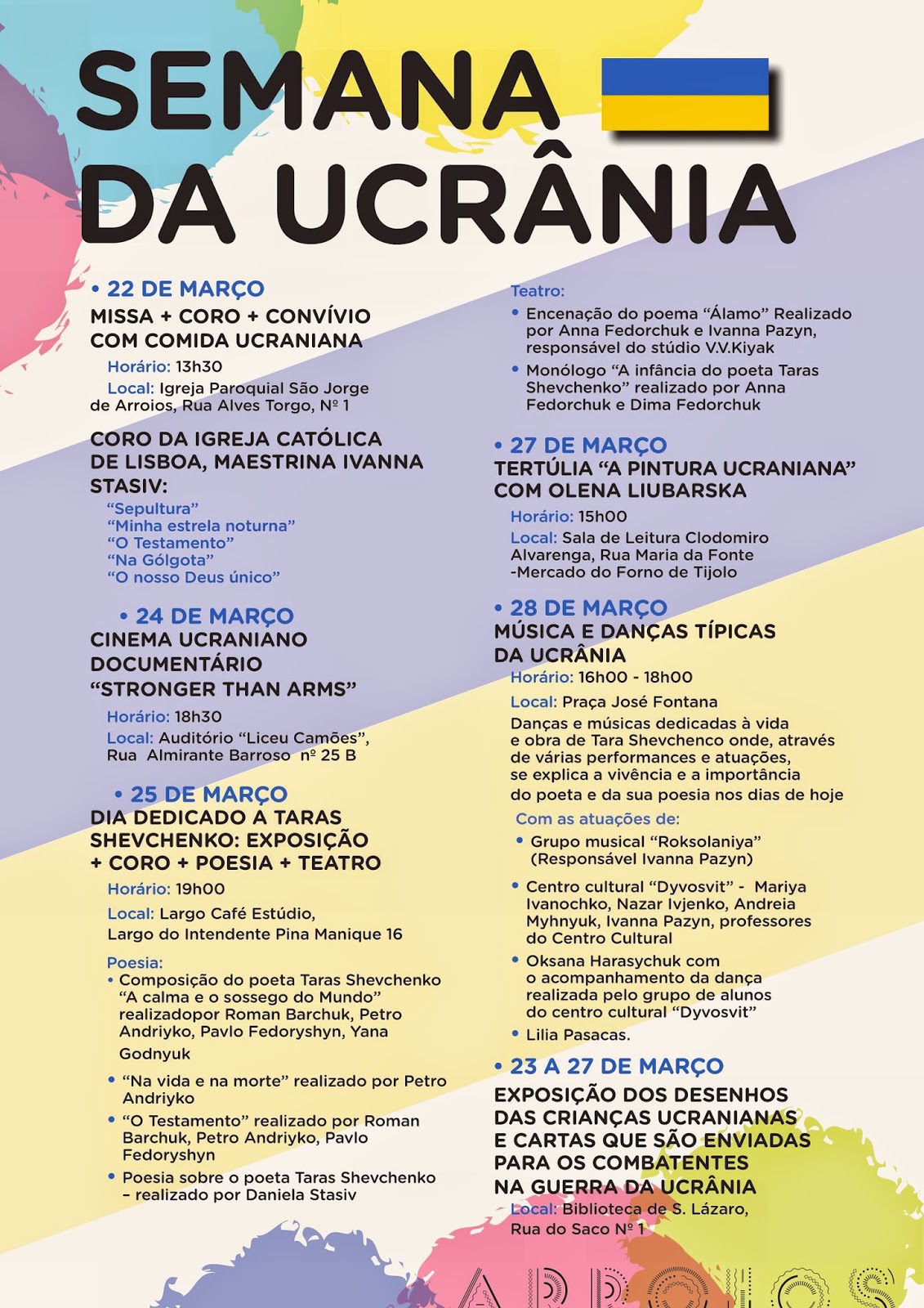 Semana Cultural da Ucrânia A Junta de Freguesia de Arroios vai celebrar a Semana Cultural da Ucrânia, de 22 a 28 de março com diversas atividades em diversos locais! Exposições, gastronomia, teatro, música e dança tradicionais e poesia são algumas das expressões culturais a que o público vai ter acesso.
