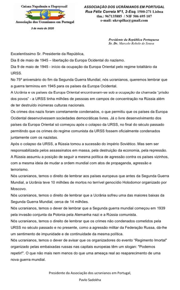 Nós ucranianos, temos o dever de avisar que os organizadores do evento “Regimento Imortal" organizado pelas embaixadas russas nas capitais europeias têm um slogan: "Podemos repetir!". O que não mais nem menos do que uma ameaça real ao reaparecimento de uma nova guerra mundial.