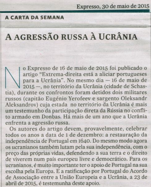 No Expresso de l6 de maio de 2015 foi publicado o artigo "Extrema-direita está a aliciar portugueses para a Ucrânia". No mesmo dia — 16 de maio de 2015 — no território da Ucrânia (cidade de Schastia)