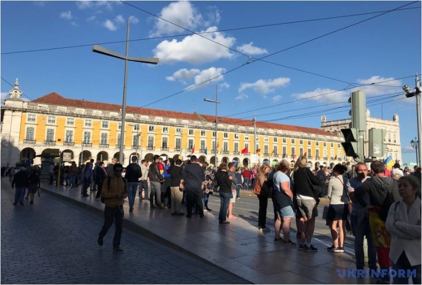 «На площі Комерції у центрі Лісабона, в Eurovillage ми розгорнули стяг України, який тримали не лише українці але й іноземці. Всі з радістю фотографувалися з прапором тримаючи його або з ним на фоні», - розповів Укрінформу голова спілки українців у Португалії Павло Садоха.