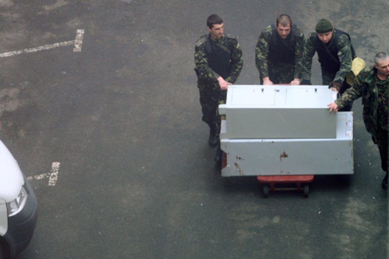Four men in army uniform are seen loading massive safes onto a trolley. Western defenses officials suspect they were stuffed with highly sensitive intelligence files, their destination most likely being Moscow. Other men in black coveralls are seen busily switching Ukrainian tags on several blue, white and gray VW and Mazda trucks. And in one picture—it has also been captured on video – a couple of Alfa members are seen storing in a van what looks like ammunition crates and a weapon protected in a canvas rifle bag.