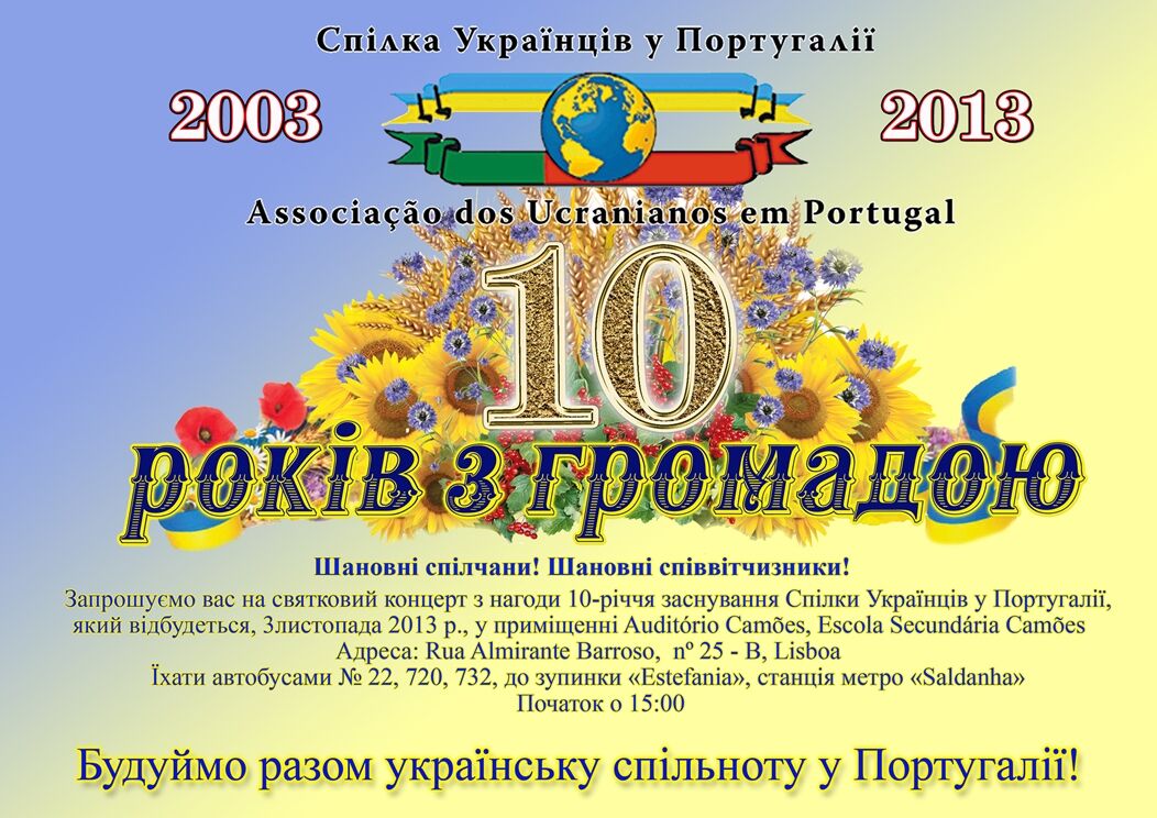 Запрошуємо вас на святковий концерт з нагоди 10-річчя заснування Спілки Українців у Португалії, який відбудеться, 3 листопада 2013 р., у приміщенні Auditório Camões, Escola Secundária Camões