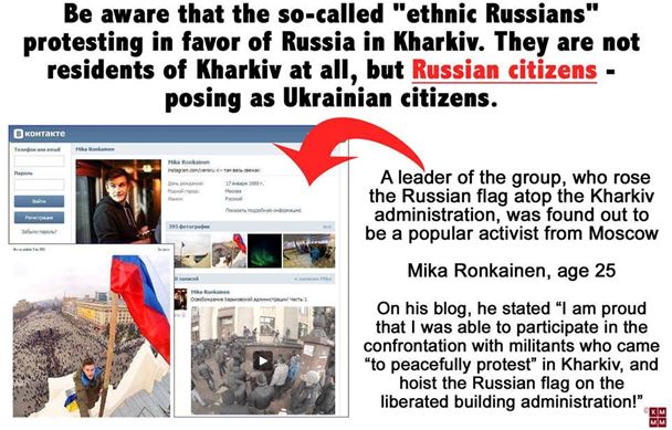 Про Україну загалом і про «проросійські мітинги». Необхідно почати з того, що немає поділу на Східну, Західну, Південну чи Північну Україну. Кожний регіон має певні культурні та мовні особливості, однак при всьому цьому різноманітті Україна є єдиною та неподільною. Проросійські настрої на Східній Україні та в Криму зумовлені активною сепаратистською пропагандою. Є свідчення того, що багато учасників проросійських мітингів – росіяни, яких привезли з сусідніх з Україною областей, досить часто в різних містах з’являються одні і ті самі «активісти». Більшість учасників таких мітингів дуже агресивно настроєні – вони знімають з обласних адміністрацій українські прапори