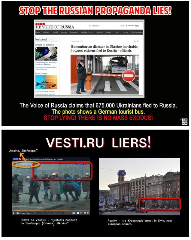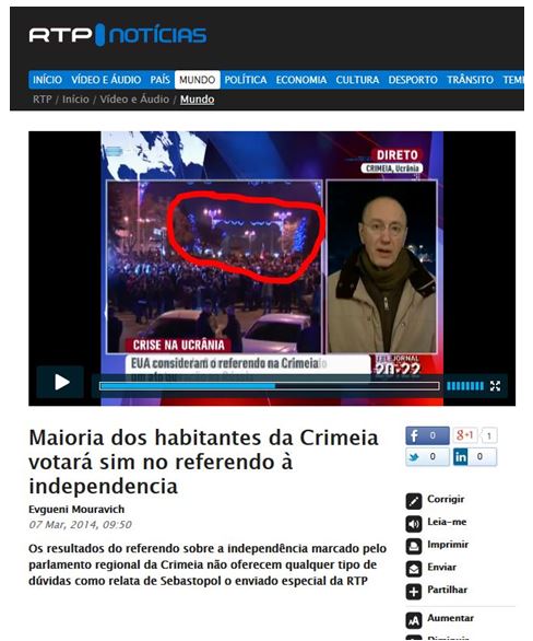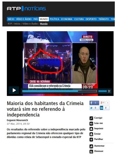 Також під час даного сюжету http://www.rtp.pt/noticias/index.php?article=721811&tm=7&layout=122&visual=61 були продемонстровані кадри «нібито» з Криму, однак це неправда. Дане відео було зняте під час сутичок між проросійськими і українськими активістами 05.03.14 у Донецьку http://www.youtube.com/watch?v=3pdZ81HNEIM .