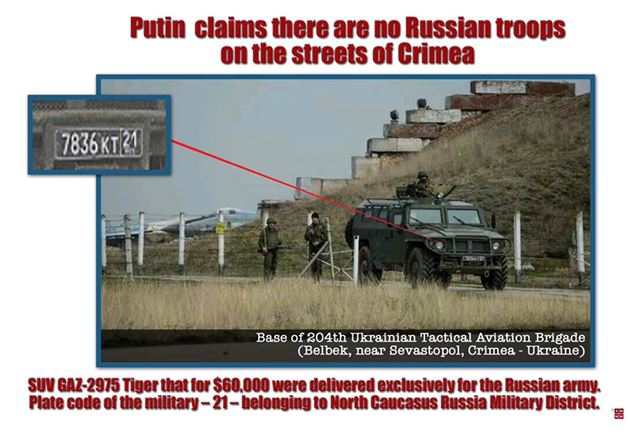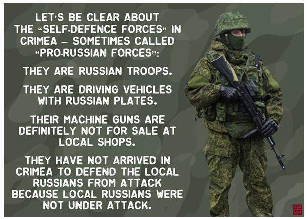 Таким чином, введення військ на територію Криму (що є складовою частиною України, її адміністративно-територіальною одиницею, що не володіє суверенітетом) є абсолютно незаконним та грубо порушує як норми внутрішнього права, так і ряд основоположних міжнародних договорів та договір між Україною та Росією про дислокацію ЧФ РФ. Росія намагається анексувати частину суверенної території, а анексія за міжнародним правом – вид агресії, міжнародний злочин. Всупереч заявам В.В. Путіна про те, що російських військових на території України немає, існує надзвичайно багато доказів зворотнього. Озброєні автоматами та снайперськими гвинтівками (що є на озброєнні виключно у РФ) військові блокують українські військові частини та здійснюють контроль над ВР АРК.