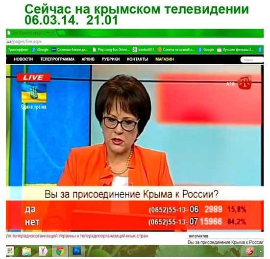 (Питання: ви за приєднання Криму до Росії? Так – 2989 голосів, Ні – 15966)