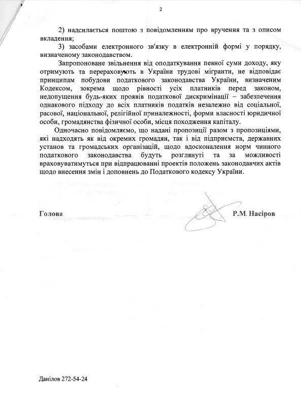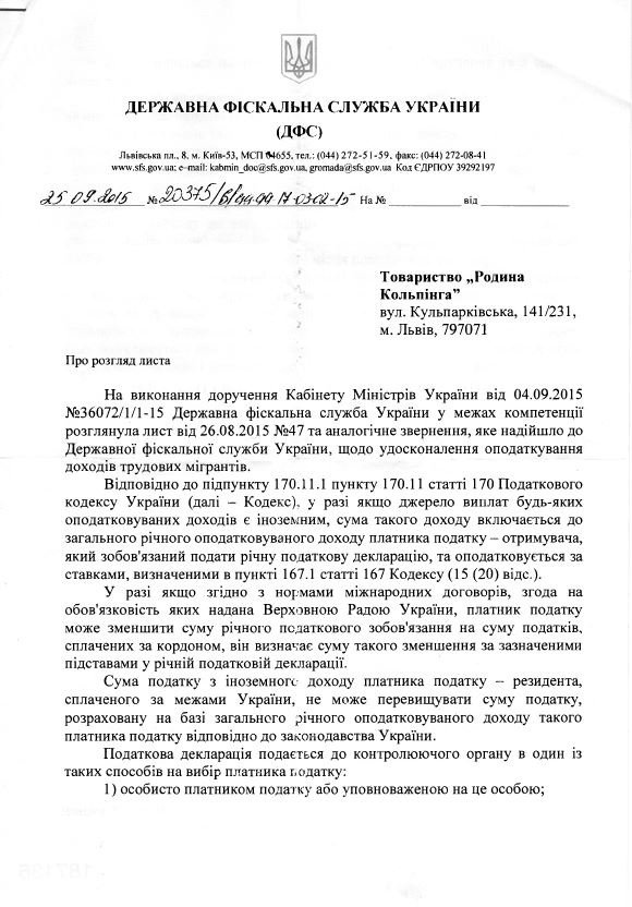 На виконання доручення Кабінету Міністрів України від 04.09.2015 №36072/1/1-15 Державна фіскальна служба України у межах компетенції розглянула лист від 26.08.2015 №47 та аналогічне звернення, яке надійшло до Державної фіскальної служби України, щодо удосконалення оподаткування доходів трудових мігрантів.