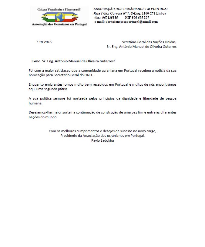 З великою радістю українська громада у Португалії сприйняла новину про Ваше призначення Генеральним секретарем ООН.