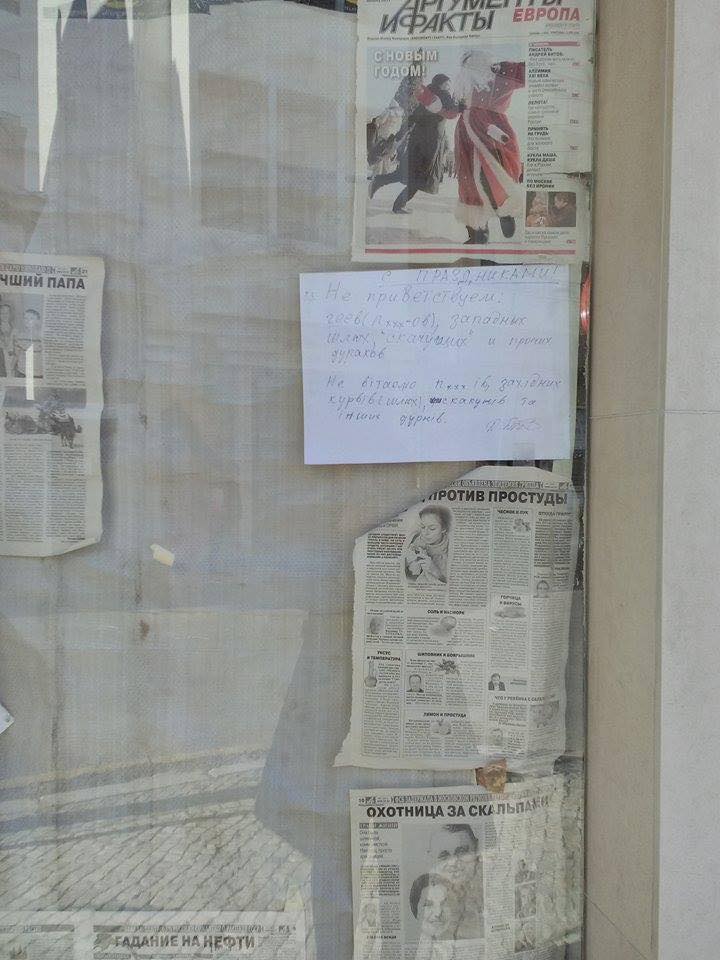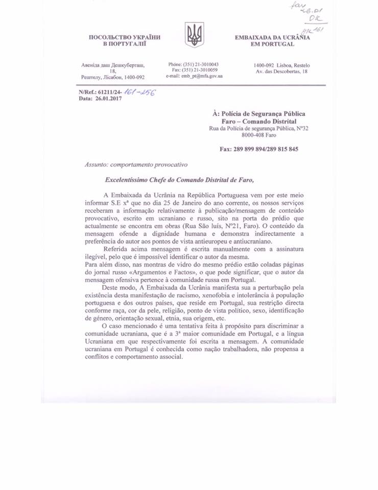 Повідомляємо, що сьогодні, 26 січня 2017 року, у місті Фару за адресою Rua São Luís , 71 на вітрині приміщення колишньої кондитерської, яка в даному часі припинила свою діяльність і перебуває у стані ремонту підготовки для відкриття нового закладу, було виявлено оголошення з провокативним текстом російською і українською мовами. Зміст тексту ображає людську гідність та натякає на прихильність автора до антиєвропейських поглядів!