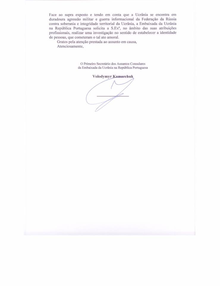 Висловлюємо нашу стурбованість і занепокоєння даним фактом, оскільки це може спричинити негативне ставлення португальців в цілому, та недовіру і підозру португальських органів правопорядку зокрема, і до українців через такі радикальні відкриті ксенофобські висловлення .