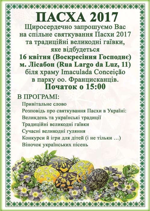 Щиросердечно запрошуємо Вас на спільне святкування Пасхи 2017 та традиційні великодні гаївки, яке відбудеться 16 квітня (Воскресіння Господнє)