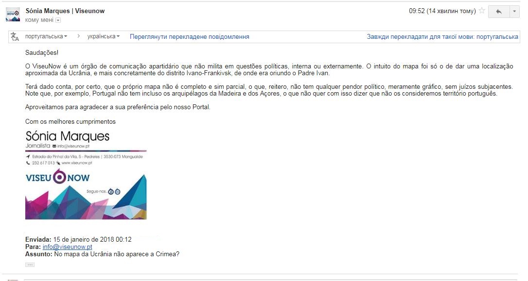 Em nome da Associação dos ucranianos em Portugal gostaria saber porque na reportagem sobre a comunidade ucraniana em Viseu no mapa da Ucrânia não aparece a Crimea? Isso é a posição oficial do vosso canal? Estão apoiar a agressão russa sobre o território nacional na Ucrânia?