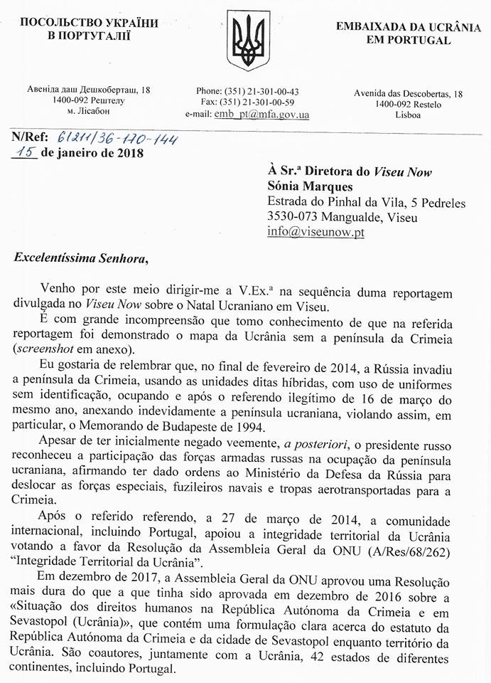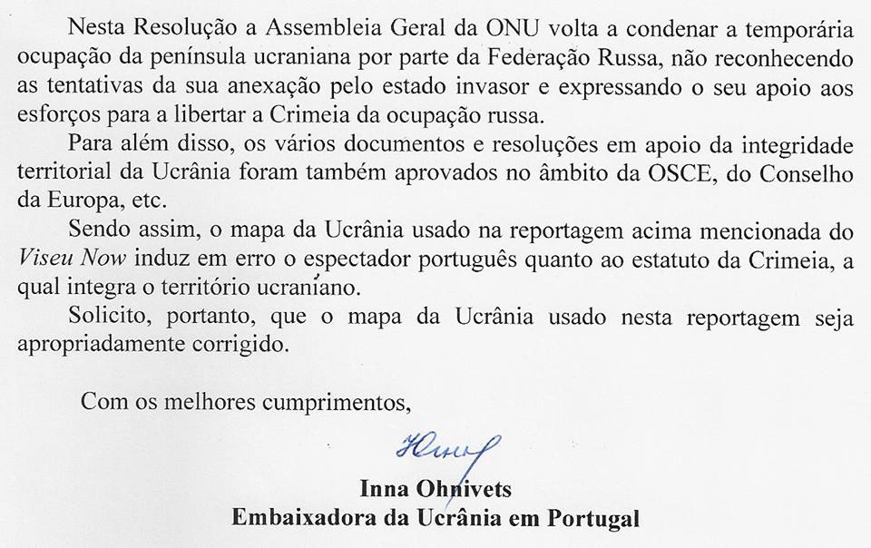 Відкритий лист Посла України Інни Огнівець до редакції Viseu Now у зв’язку з репортажем «Українське Різдво у Візеу», в якому було використано мапу України без Автономної Республіки Крим (screenshot додається).