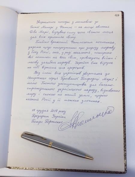 Mensagem do Presidente da Ucrânia, Petro Poroshenko, no livro de honra do Santuário de Fátima (17 de dezembro de 2017)