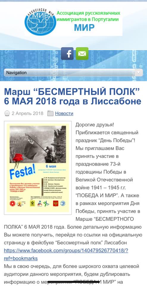 Це власне, ця асоціація була головним організатором акції «Безсмертний полк» у Лісабоні 6 травня, де пропагувалася московська агресія проти України, включно з символікою терорестичних організацій ДНР/ЛНР (http://www.umoloda.kiev.ua/number/0/2006/122892/).