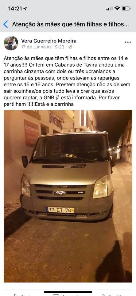Особа під іменем Vera Guerreiro Moreira опублікувала пост у Facebook в якому попереджує, щоб бути обережними з трьома українцям які переслідують малолітніх дівчат у місті Тавіра.