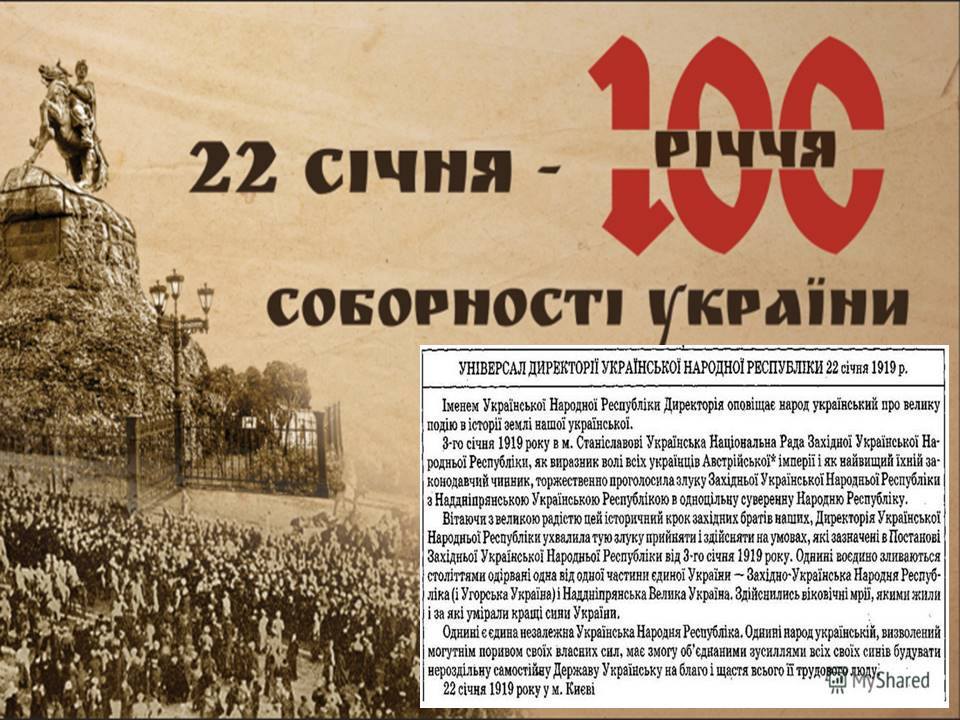 22 січня 2019 року - 100-річчя проголошення Акту злуки Української Народної Республіки та Західноукраїнської Народної Республіки.