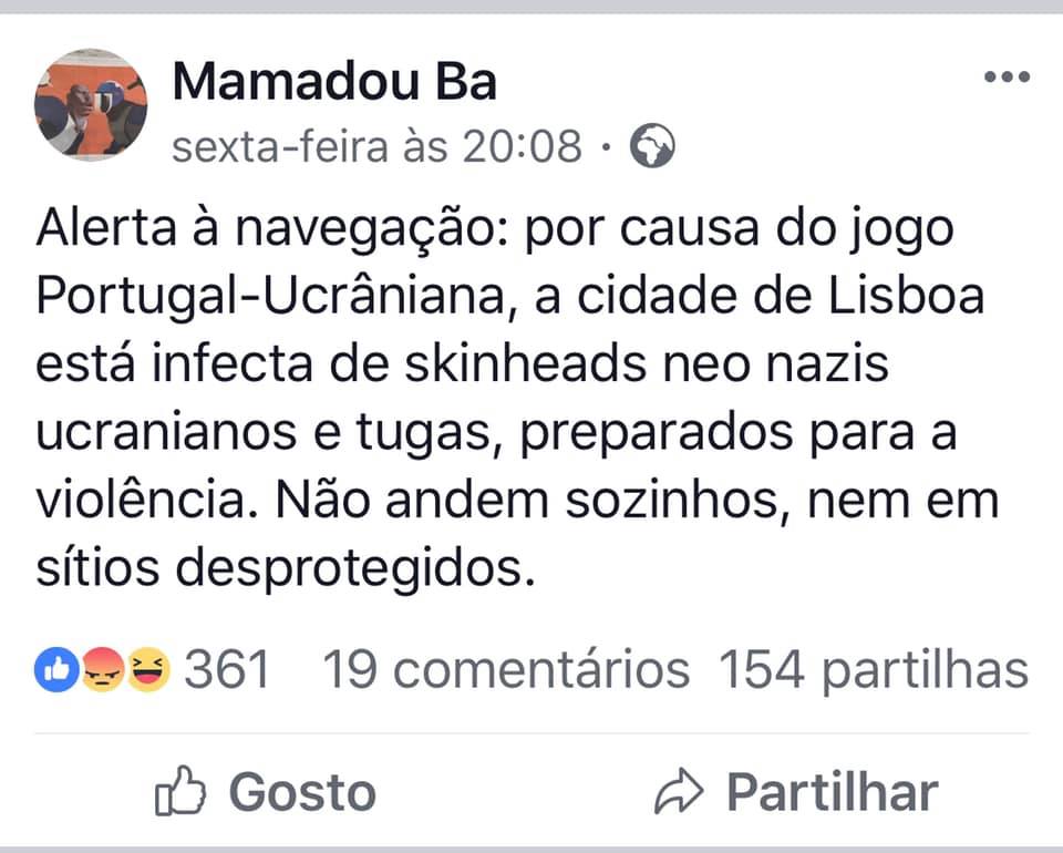 Na véspera do jogo de futebol entre as seleções Portugal e Ucrânia que decorreu no estádio da Luz a 23 de Março de 2019 foi publicado na página do Facebook de “Mamadou Ba” às 20h08m o seguinte post: