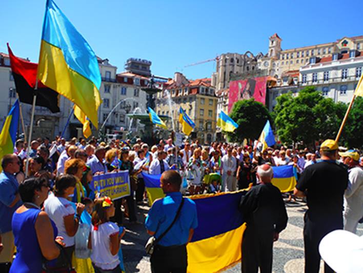 До 400 українців приєдналися сьогодні до мітингу і мирної ходи проведених зранку на центральних площах Лісабону – Комерційної та Дон Педро IV. Таким чином українці Португалії вшанували 23-ю річницю Незалежності України.