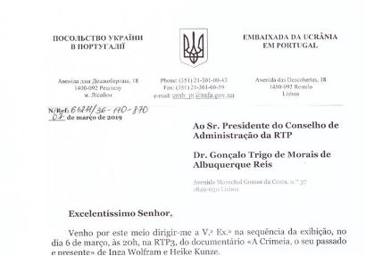 Відкритий лист Посла України Інни Огнівець на ім’я Президента Ради Директорів RTP3 Г. Албукерке Реіш у зв’язку з використанням логотипа Посольства України у розміщеному на веб-сайті RTP3 повідомленні про показ проросійського фільму «Крим крізь