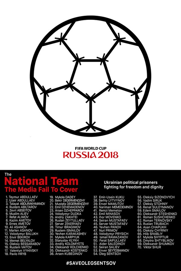 #FreeOlegSentsov, #FreeSentsov, #WorldCup, #FIFA2018, #LetMyPeopleGo, #Boycott_Russia, #Boycott_FIFA2018, #boycottWorldCup2018, #MH17, #WorldCup2018, #stoprussia, #SaveOlegSentsov