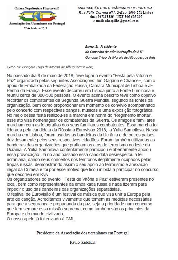 6 травня 2018 року в м.Лісабон, одночасно з проведенням офіційних заходів з відкриття Євробачення-2018, відбулася акція «Безсмертний полк», організована Асоціаціями «Юрій Гагарин» та «Шанс+» за підтримки Посольства РФ у Португалії, Федеральної