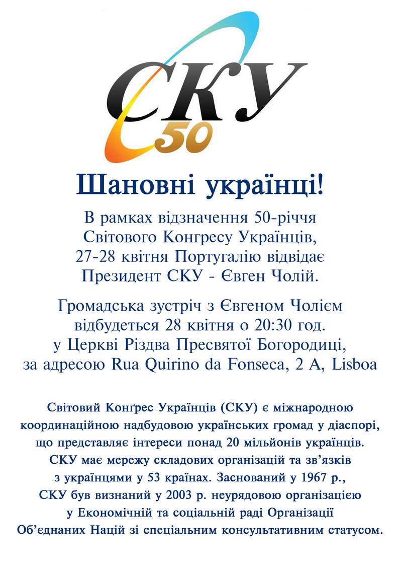 В рамках відзначення 50-ліття СКУ, 27-28 квітня Президент Світового Конгресу Українців Євген Чолій перебував з робочим візитом у Португалії.