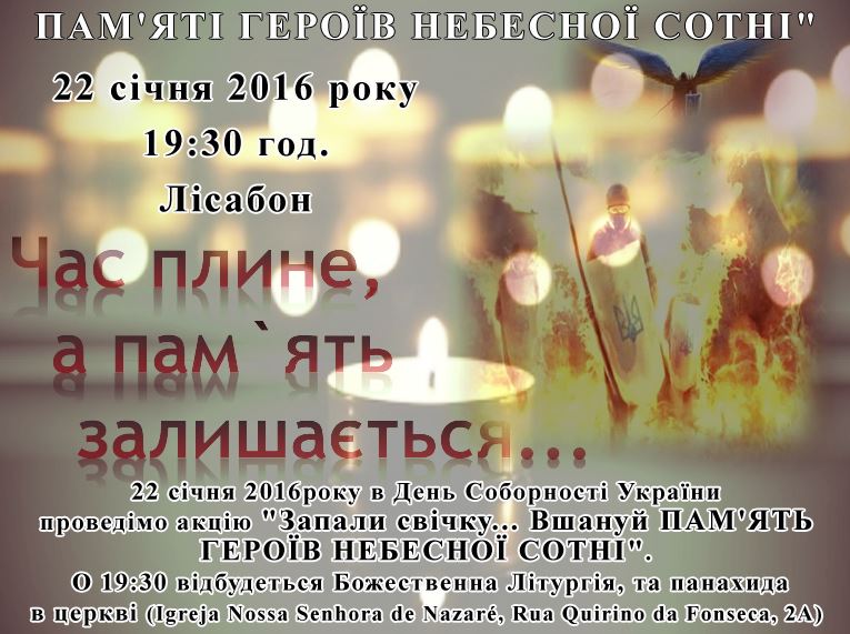 "Запали свічку... Вшануй ПАМ'ЯТЬ ГЕРОЇВ НЕБЕСНОЇ СОТНІ", з таким закликом 22 січня 2016 року отці Української Греко-Католицької Церкви в Лісабоні відслужили Божественну Літургію та панахиду вшанувавши пам'ять