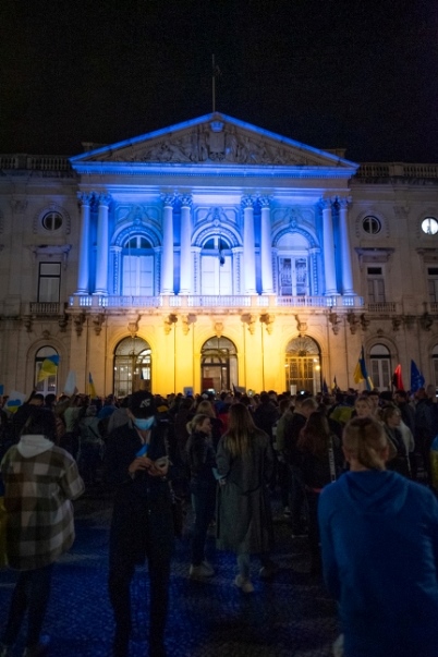 Centenas de pessoas reuniram-se na Praça do Município, onde o edifício dos Paços do Concelho foi iluminado com as cores da bandeira da Ucrânia.