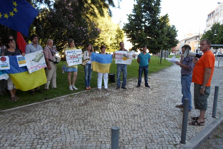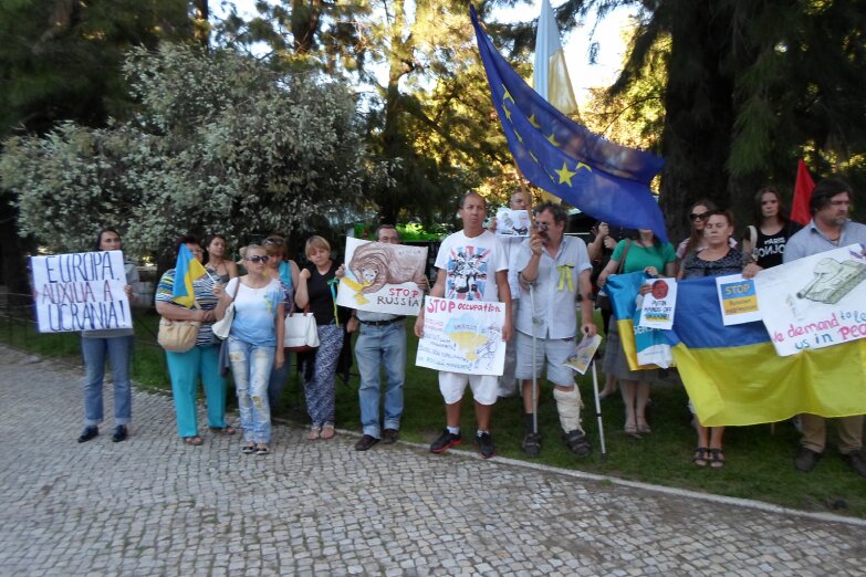 Українська громада у Португалії провела сьогодні мітинг під посольством Німеччини в Лісабоні щоб виразити свою незгоду з надто «м’яткою» позицією канцлера Німеччини пані Ангели Меркель, щодо агресії путінської Росії по відношенню до України. Як відомо, позиція Німеччини у європейській політиці є дуже вагомою і спроби перевести пряму агресію Москви у формат безкінечних переговорів та ще й із залученням до цього процесу ватажків терористичних банд, коштує Україні щоденними втратами не тільки серед військових, але й цивільних громадян.